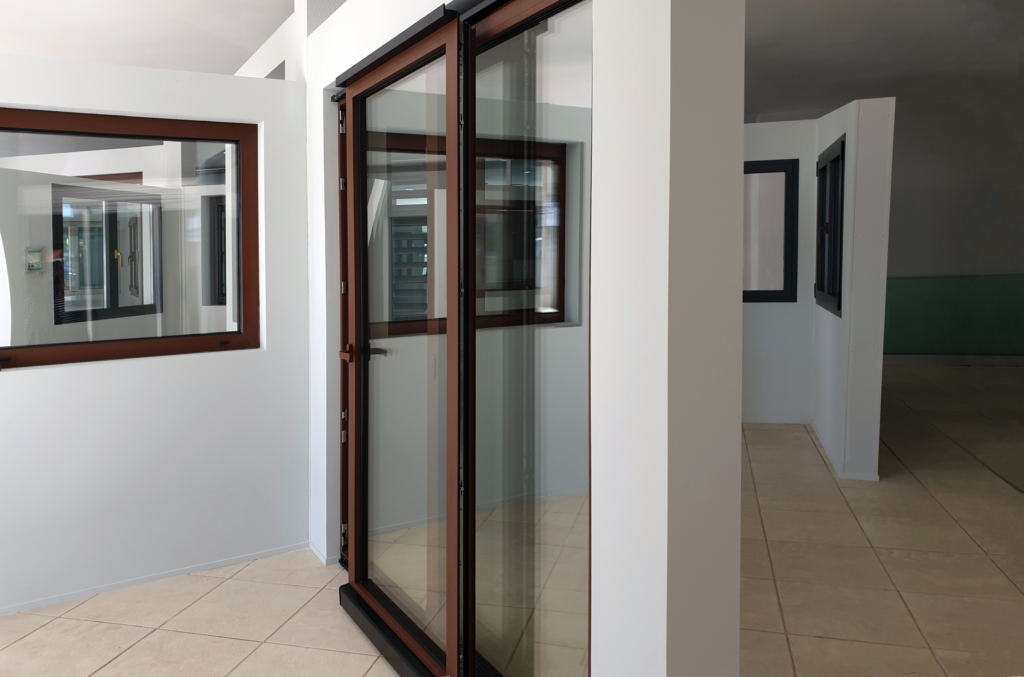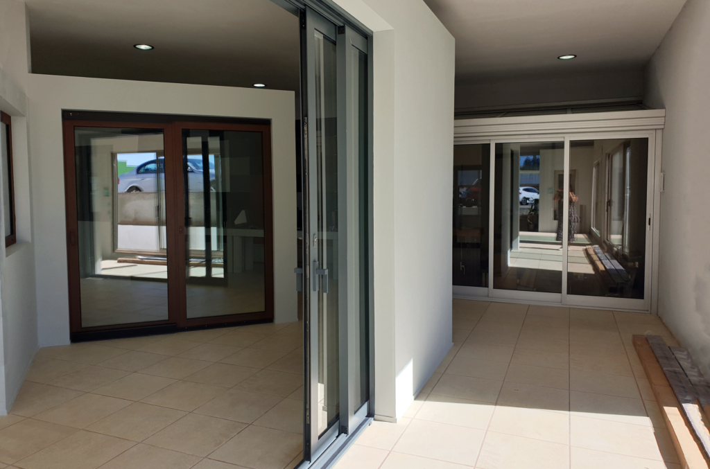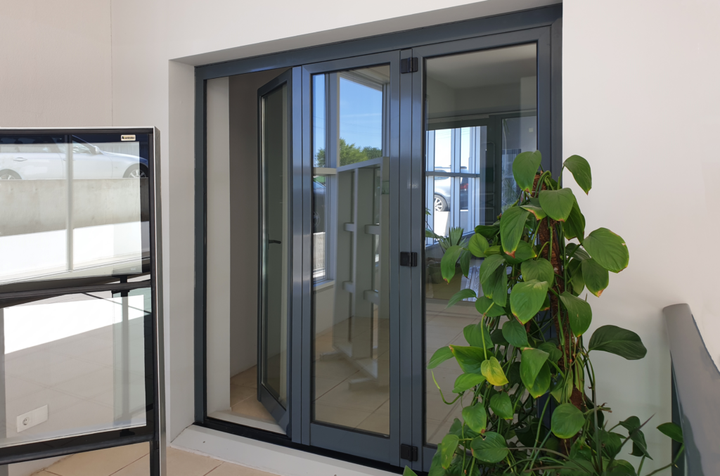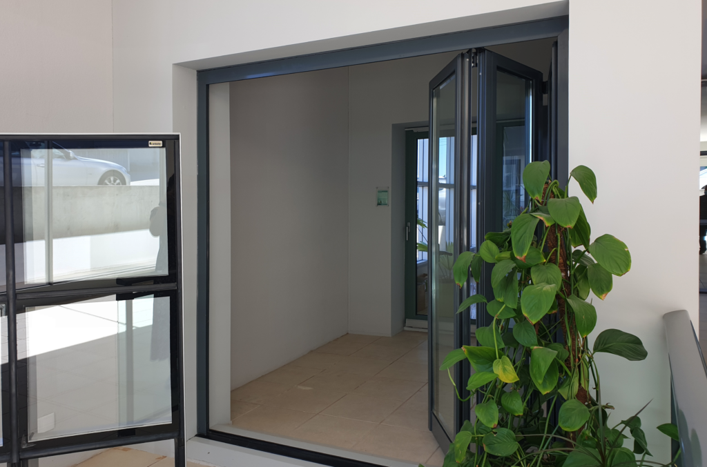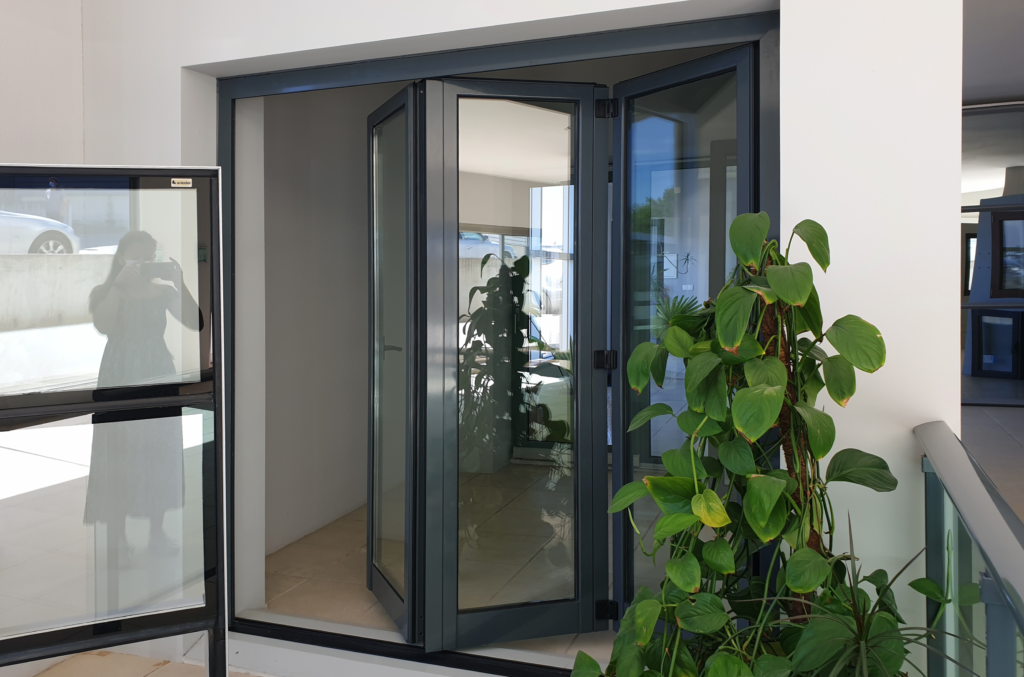 Quer isto dizer que os elementos envidraçados são dobrados para o interior ou exterior e vão abrindo de uma forma sequencial emparelhando-se com as restantes, sendo suportados através de carris. Este sistema permite uma abertura total do vão, com a possibilidade do primeiro vão poder ser utilizado como uma porta de entrada.